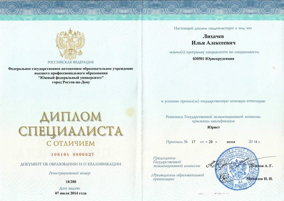 с отличием по специальности «юриспруденция» №106104 0000627 от 07.07.2014