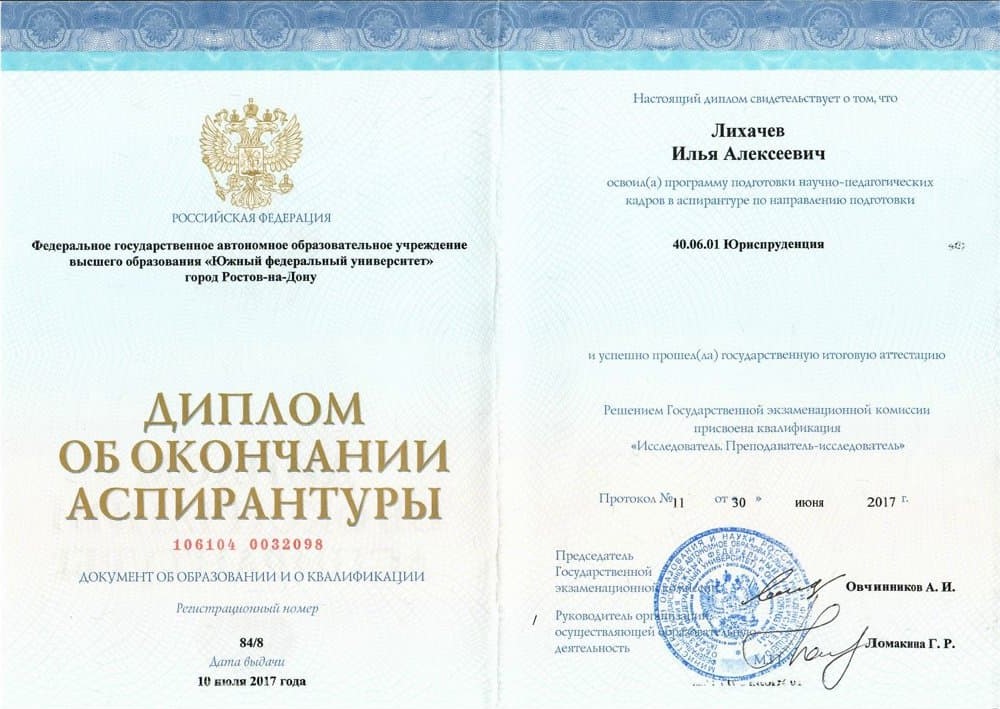 2014 – 2017 – ФГАОУ ВО «Южный федеральный университет» (бывш. РГУ), диплом об окончании аспирантуры по направлению подготовки «юриспруденция» №106104 0032098 от 10.07.2017
