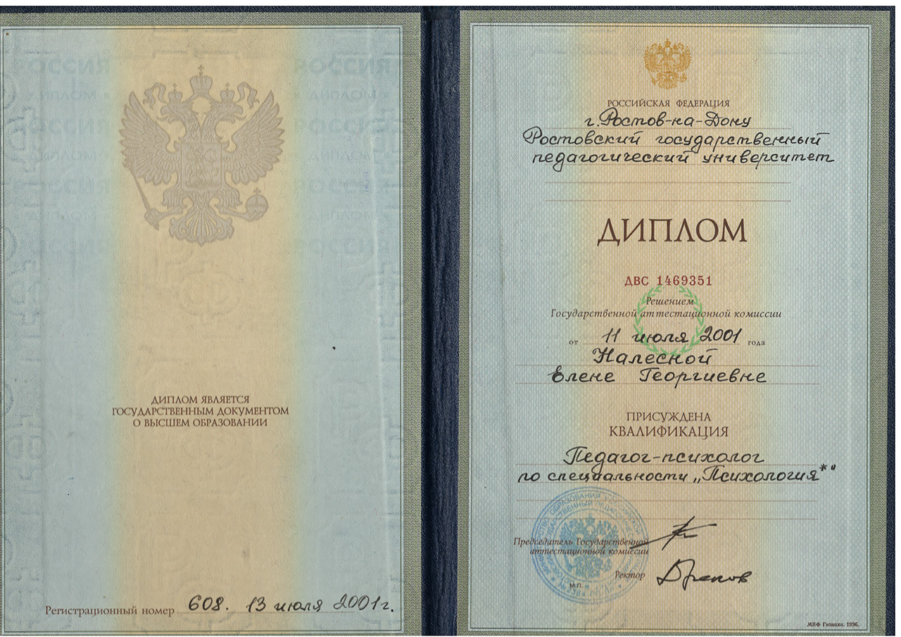 1996г.-2001г. – Ростовский государственный педагогический университет , диплом по специальности «Психология» ДВС 1469351, рег. номер 608 от 13 июля 2001г.