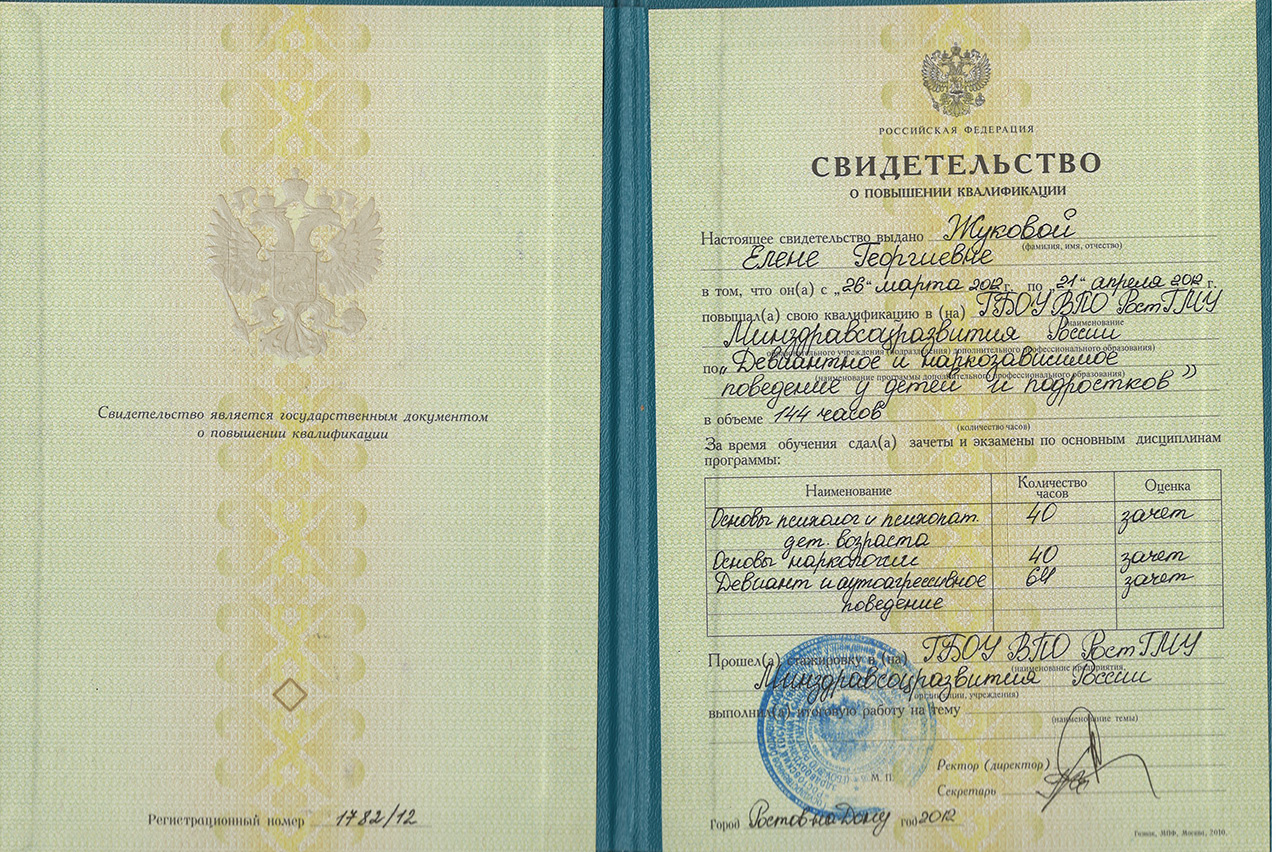 2012г. – ГБОУ ВПО РостГМУ Минздравсоцразвития России, повышении квалификации по программе «Девиантное и наркозависимое поведение у детей и подростков». Свидетельство рег. номер 1782/12 от 21 апреля 2012г.