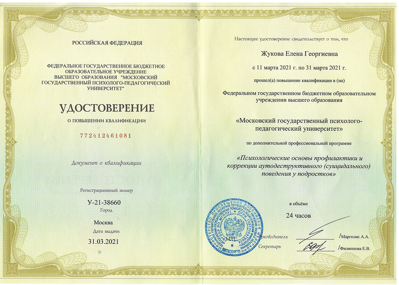 2021г. — ФГБОУ ВО «Московский государственный психолого-педагогический университет», повышение квалификации по программе «Психологические основы профилактики и коррекции аутодеструктивного (суицидального) поведения у подростков». Удостоверение №772412461081, рег. номер У-21-38660 от 31.03.2021г.