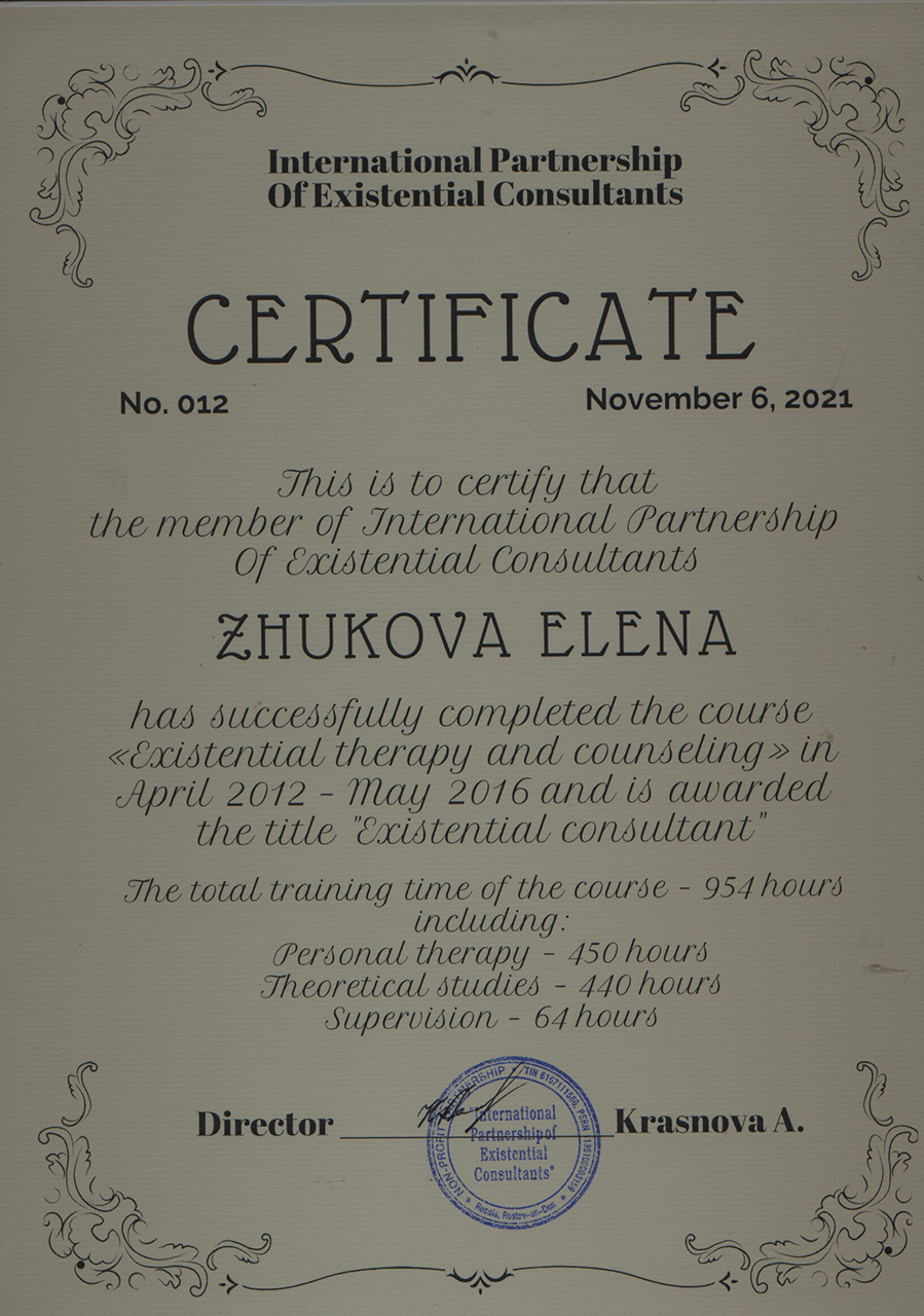 2012г.-2016г. – Международный институт экзистенциального консультирования (МИЭК). Сертификат №012 от 6 ноября 2021г.